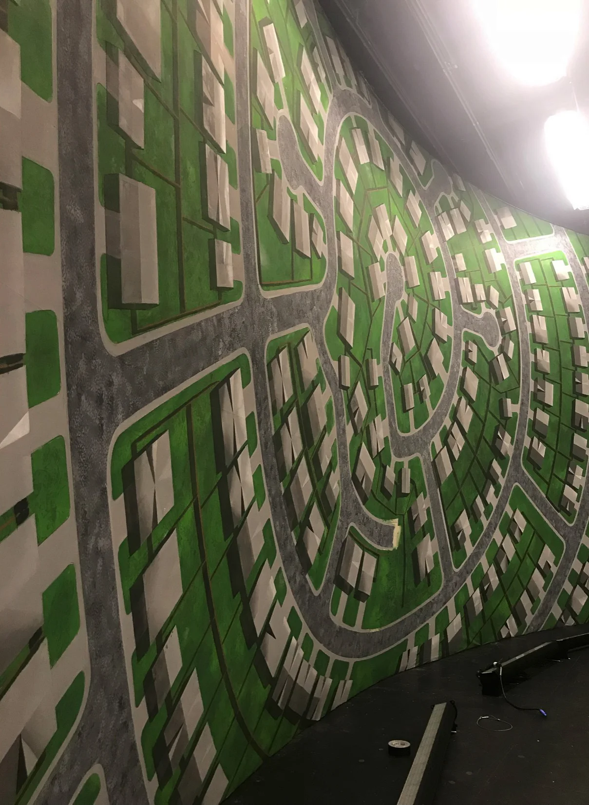 The design for Next to Normal was fairly straightforward with our major scenic element being a 20’x80’ curved drop upstage of the physical scenery. With an average crew of 5 painters a day (most of whom hadn’t painted drops before) it became a great learning opportunity to paint. The real fun came when it was installed on a curved pipe (spanning 16’ of depth) and working to ensure it was pulled taught.